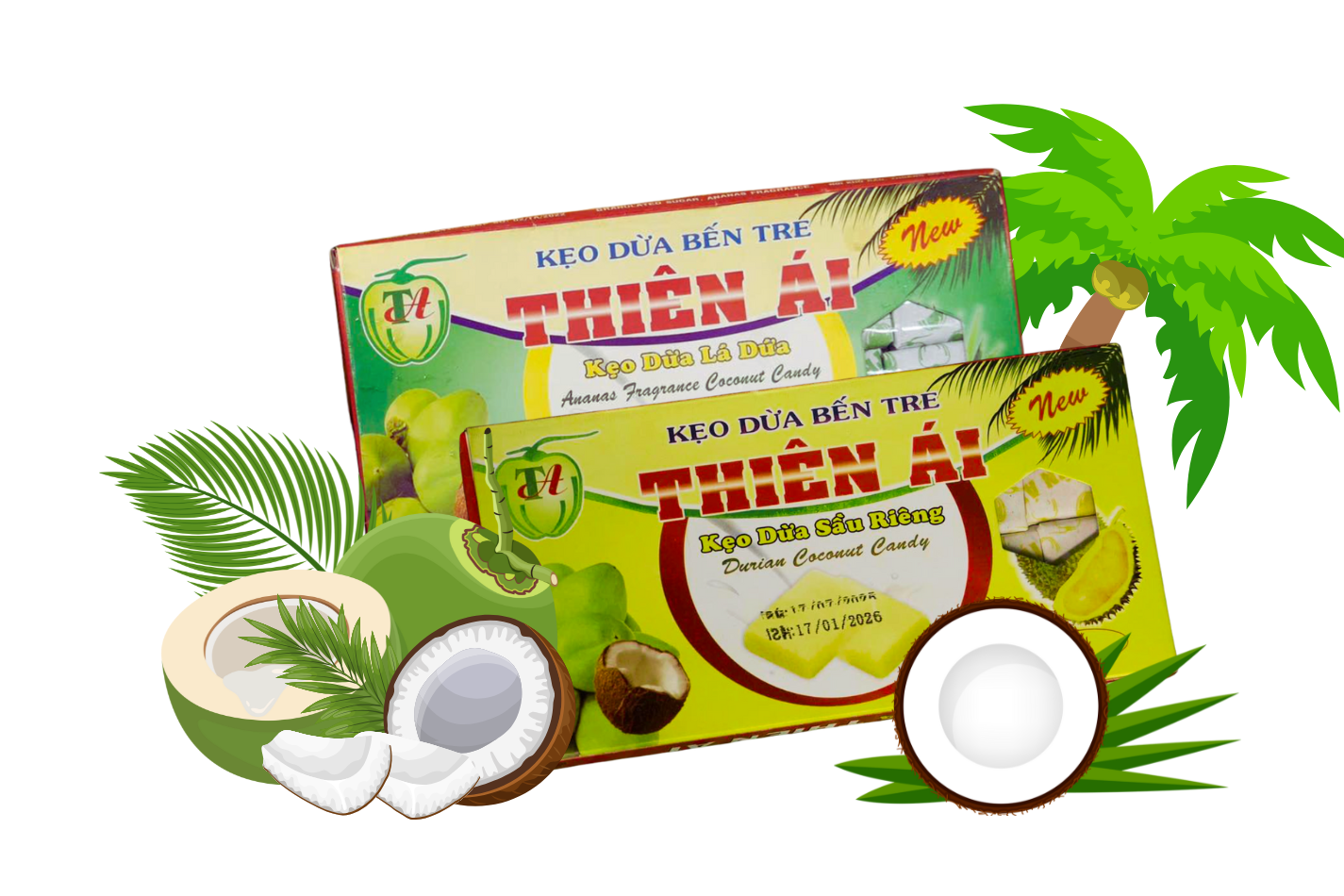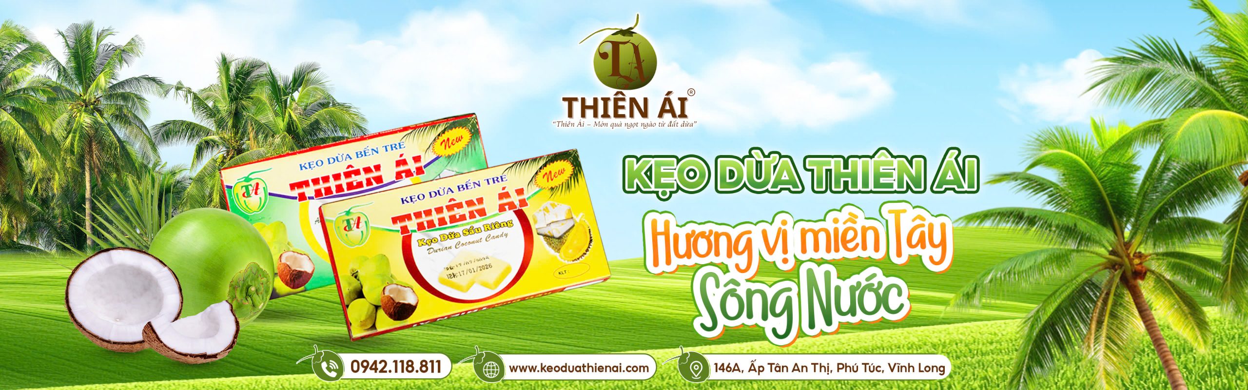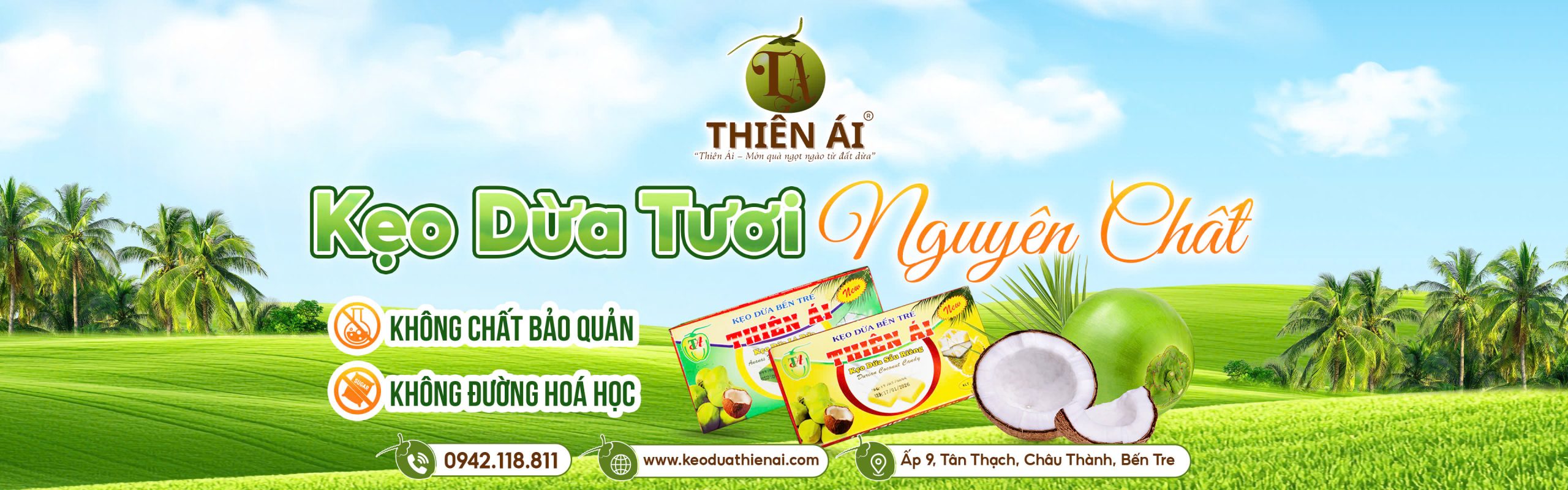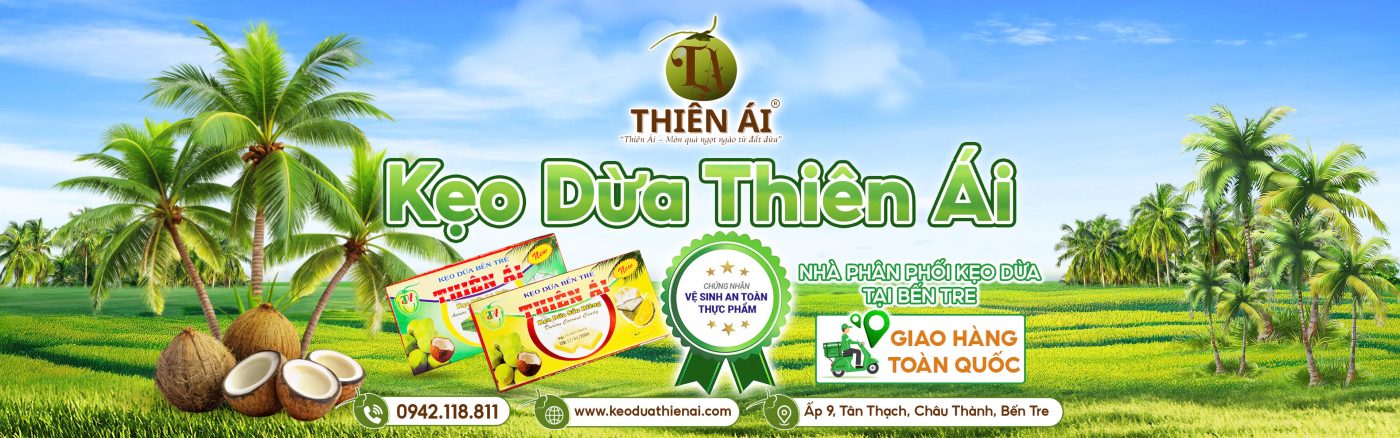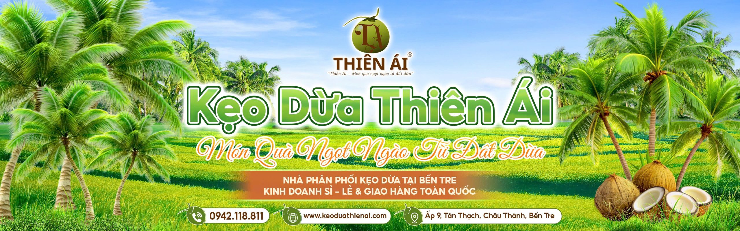 Ra đời từ cái nôi của đặc sản kẹo dừa Bến Tre, Kẹo Dừa Thiên Ái đã trở thành nhà phân phối uy tín trong lĩnh vực kẹo dừa truyền thống và hiện đại. Với sứ mệnh gìn giữ tinh hoa hương vị quê hương, Thiên Ái không ngừng mở rộng hệ thống phân phối, mang sản phẩm chất lượng cao đến tay khách hàng trong và ngoài nước. Kẹo Dừa Thiên Ái – Uy tín trong từng sản phẩm, tận tâm trong từng dịch vụ, cam kết mang đến cho đối tác và khách hàng những giá trị bền vững nhất.