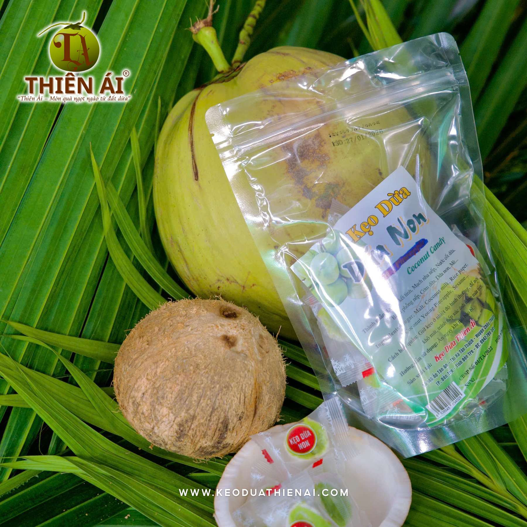 • Thành phần: dừa non Bến Tre, mạch nha, đường tinh luyện, hương lá dứa, bánh tráng mỏng.